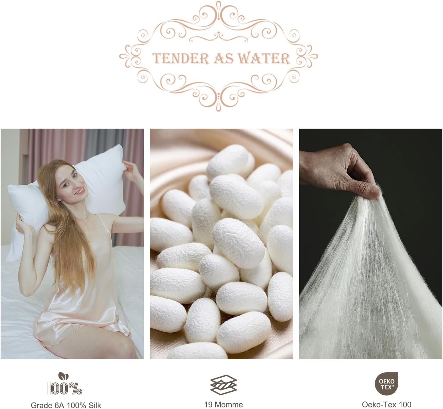 Enjoy Sweet Sleep Every Night:Tender As Water Silk pillowcases are made of 19 momme Grade 6Amulberry silk fabric,real silk contains 80% of nature protein and 18 kinds ofamino acid to effectively stimulate the metabolism of skin cell,It takes youinto a beautiful dream,Enjoy sweet sleep and a comfortable daily life,offeringextreme smoothness and softness for your luxurious and indulgent sleepexperience.