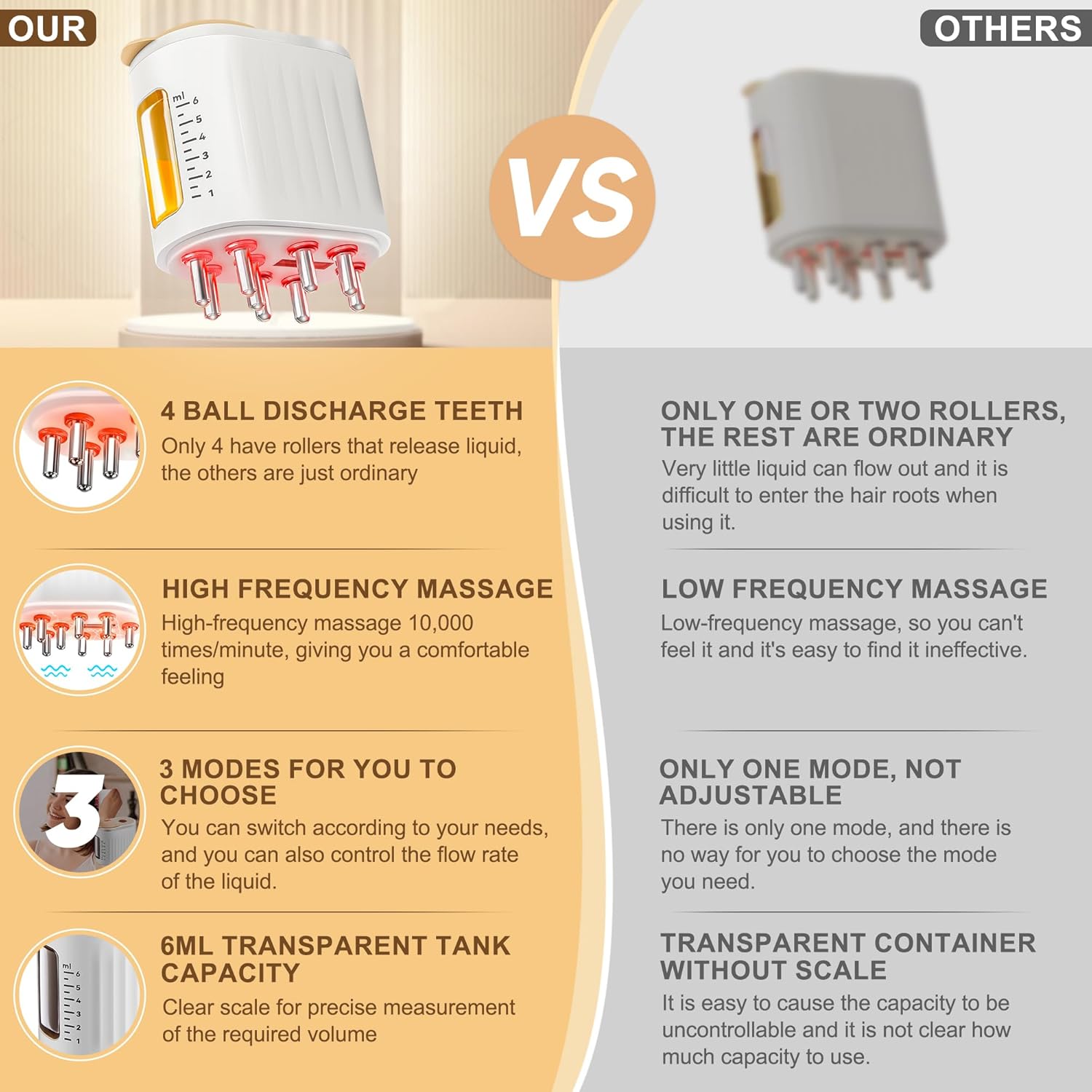[2 in 1 Hair Oiling Applicator]:Hair oil applicator accurately delivers liquid or essential oil to the hair roots through 4 liquid dispensing teeth combined with vibration massage.At the same time,the scalp oil applicator has a patented negative pressure liquid dispensing technology,which can control the amount of oil dispensing by pressing the top rubber cap and prevent the waste of medicine or essential oils.Oil dispenser for hair is suitable for minoxidil,essence,nutrient solution,conditioner,essential oil,etc.