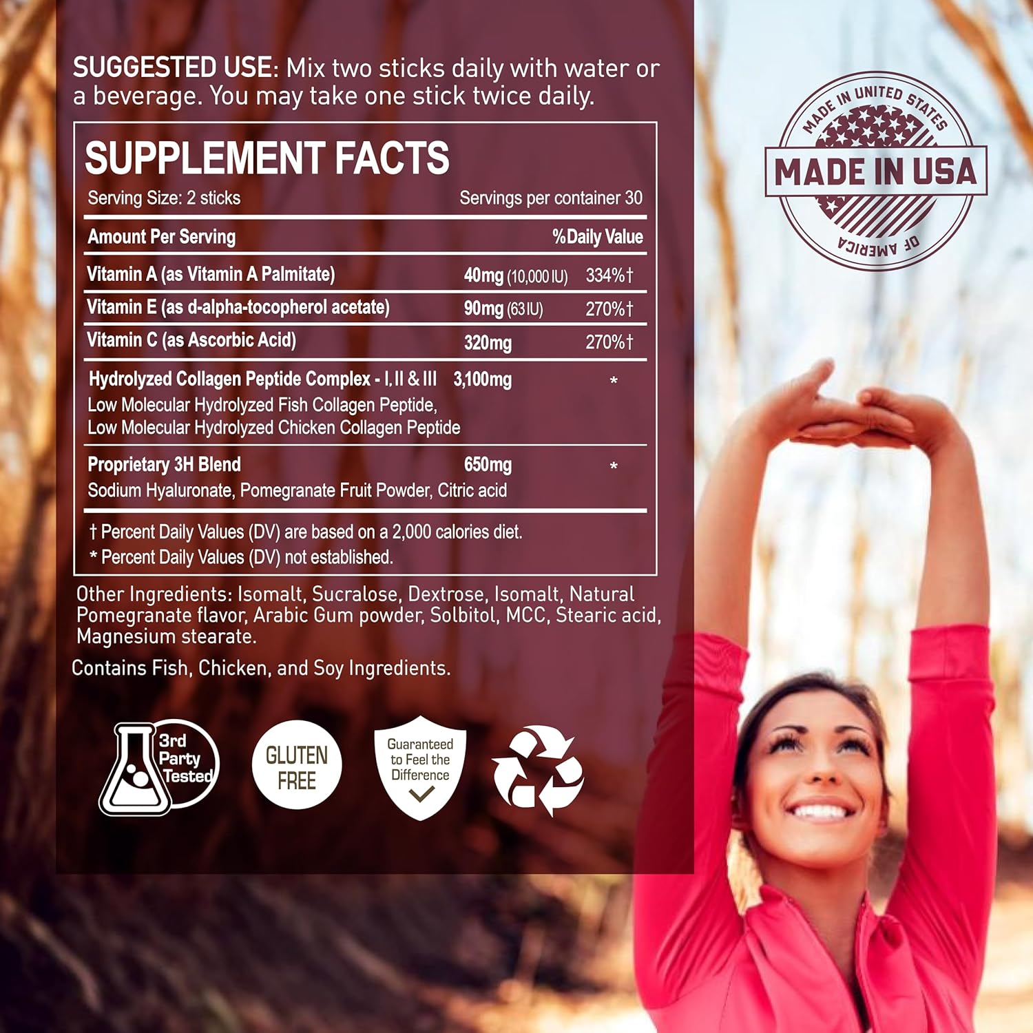3H Collagen Peptide Powder – Types I, II, & III with Vitamin C, Hydrolyzed Elastin Peptide & Hyaluronic Acid – Supports Hair, Skin, Nails, Joints & Bones – 60 Sticks, 30 Day Supply