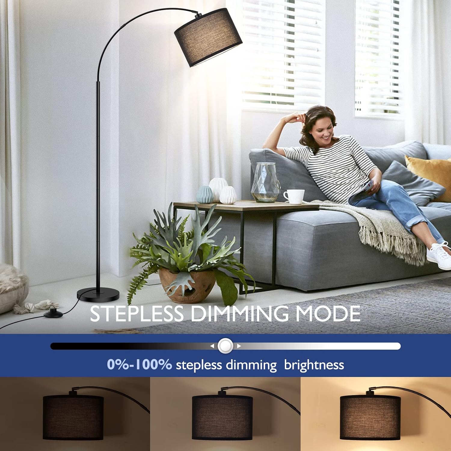 Stepless Dimmable & 3 Color temperatures : Bdrofn arc floor lamps has stepless brightness adjustment (from 1%-100%), and stepless color temperature: 3000K-6000K, you just need to choose the light that suits you through the included remote,This dimmable floor lamp also have pre-set modes offering various scenes such as: read, nursery, work and night light. The memory function can help you remember the last setting