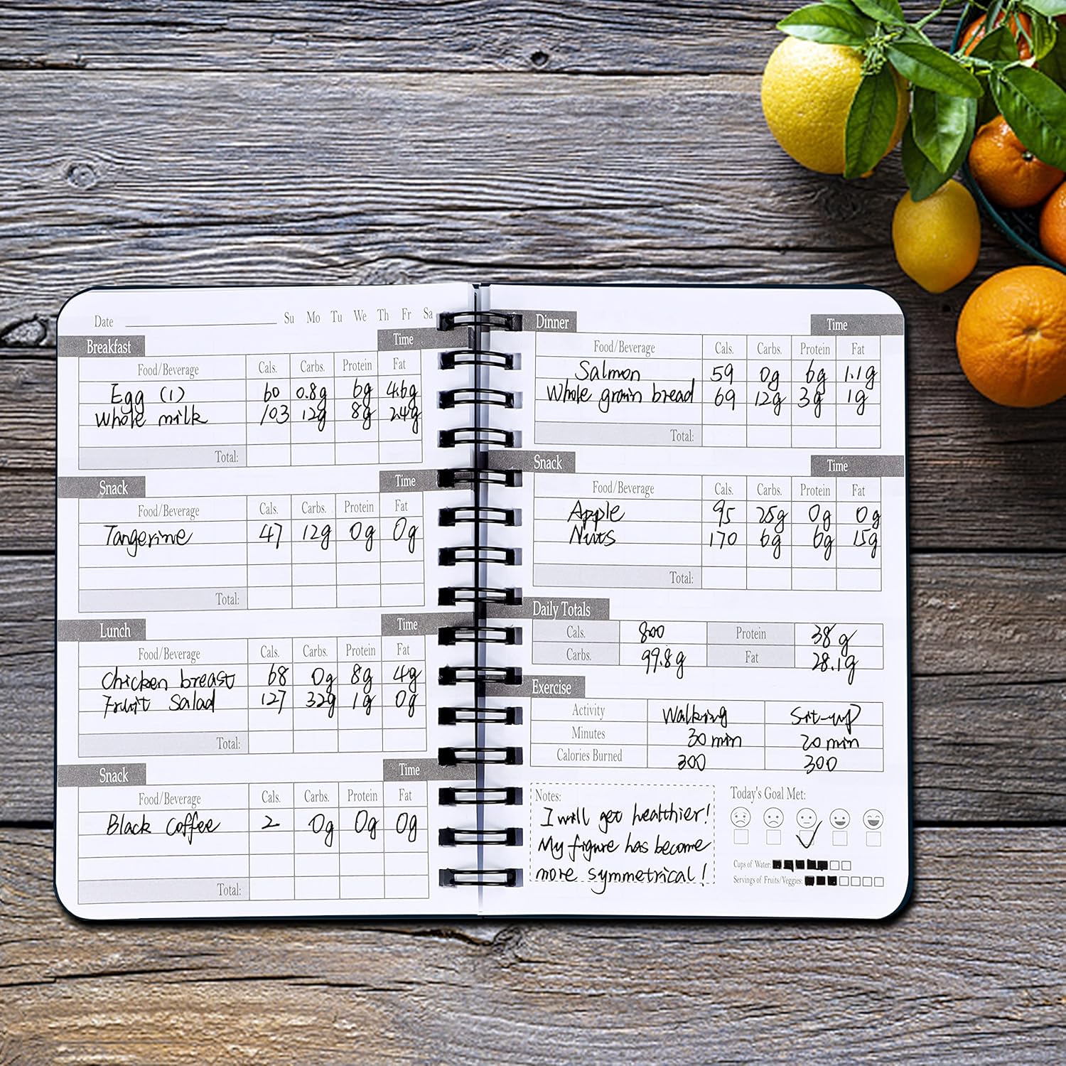 A Daily Food Journal that helps you keep track of calories, carbs, fats, and sodium per meal. Side Bound Wire-O Binding so Notebook Lays Flat. Archival safe, acid-free, 60 lb. paper, Page Dimensions: 3 1/2″ x 5 1/4″, convenient to take out and record anytime. Easily record your food consumption: breakfast, lunch, dinner and snacks, up to 5 Meals to organize all of your meals for the day. Keep track of your daily activity and exercises, control how your mood reflects on your will and eating habits.