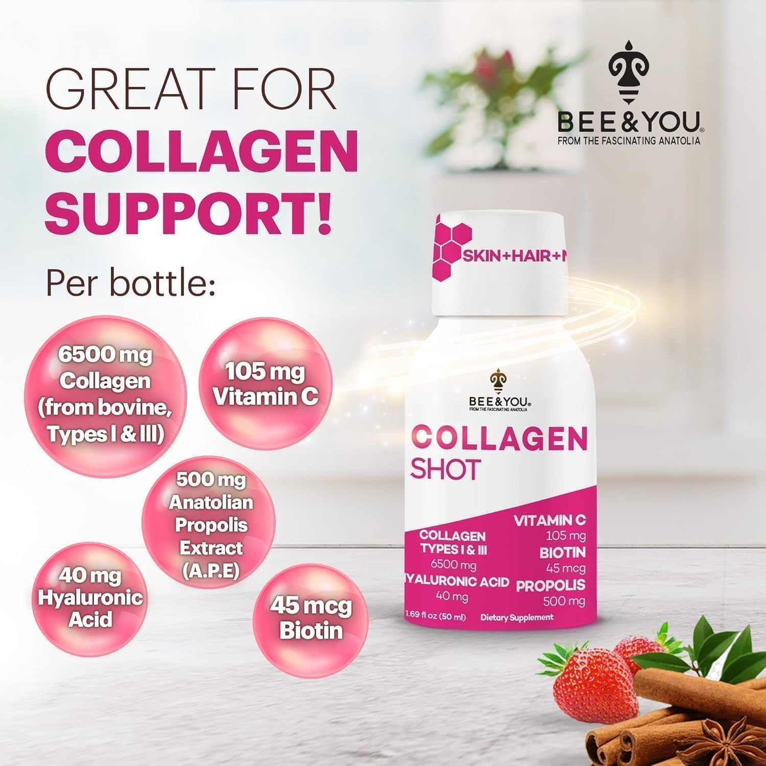 Bee and You Collagen Liquid Shot Drink with Vitamin C, Propolis Extract, Hyaluronic Acid, Biotin, Promotes Skin, Hair, Nail and Joint Health, 1.69 fl. Oz x 12 Pack