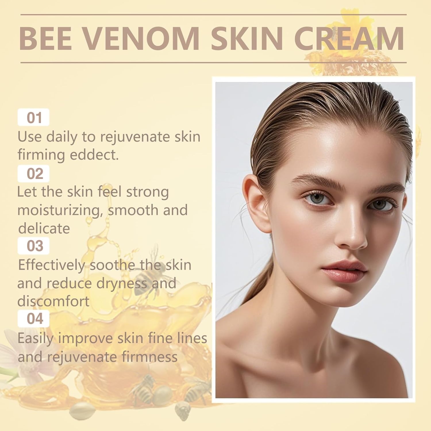 【Deep Moisturizing】Hydrate and nourish your skin with our bee venom firming serum. Natural ingredients in the anti aging skin oil boost hydration and moisturization to restore your skin’s hydrolipid network and bring out its natural youthful glow.