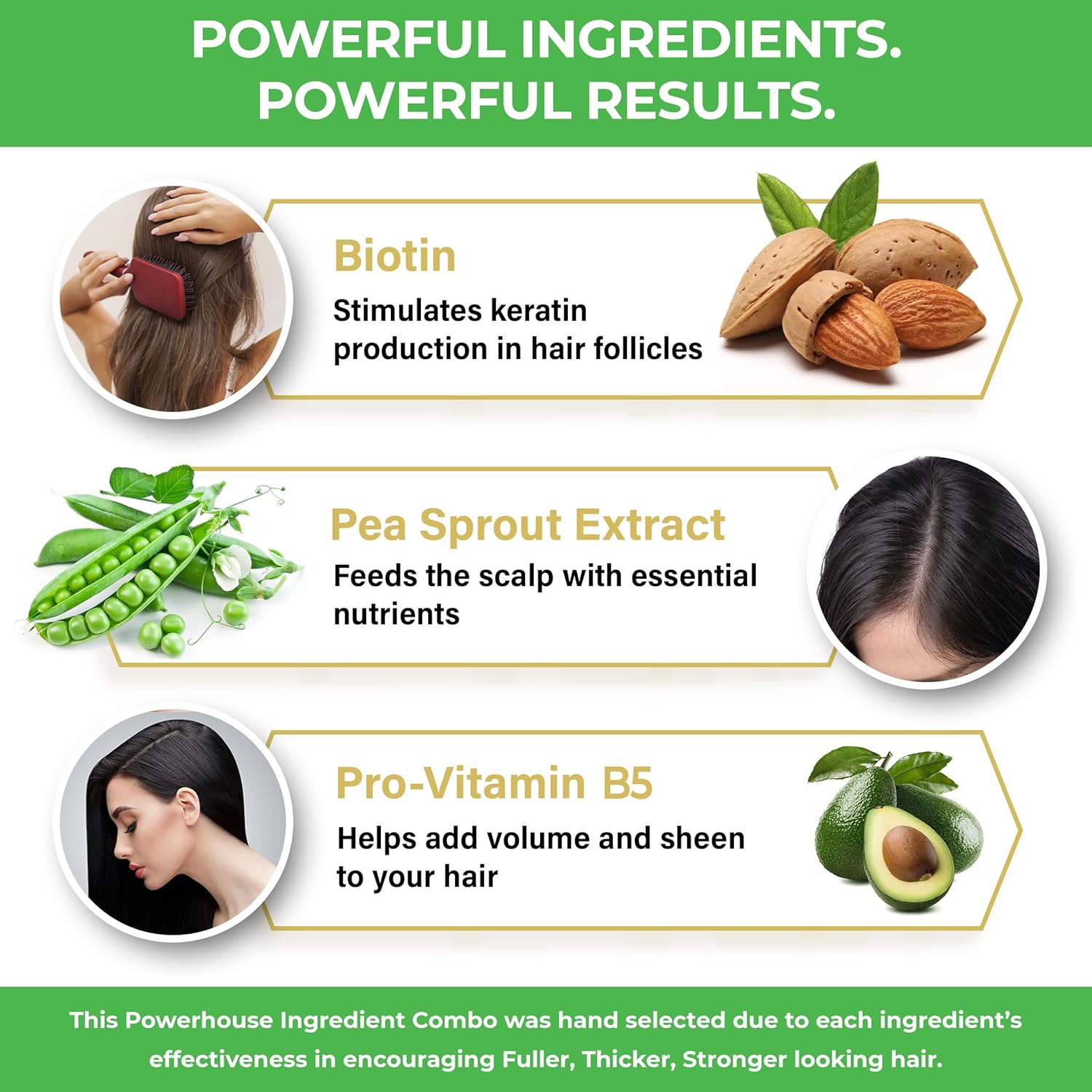 Its advanced formula contains hair growth stimulating ingredients of premium quality. Biotin and Pro-Vitamin B5 help in nourishing the hair follicles, strengthening their roots and promote thicker and healthy hair growth. Pisum Sativum Pea Sprout Extract and other active nutrients help in moisturizing and providing soft and healthy texture to your hair.