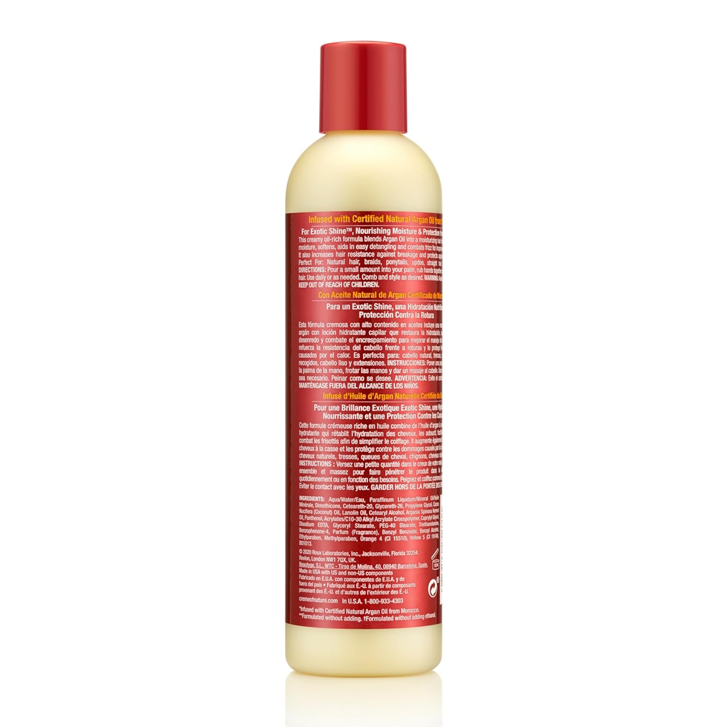 Argan Oil Moisturizer is an oil-rich formula that restores moisture, deeply nourishes, protects against heat styling and strengthens damaged hair. PRODUCT BENEFITS •Gives long-lasting softness and Exotic Shine •Restores moisture •Heat protectant •Infused with Argan Oil from Morocco