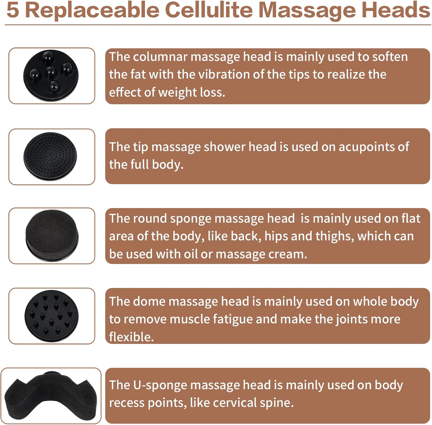 🌷【5 Replaceable Cellulite Massage Heads】The 5 different replaceable cellulite massage heads can give you more massage experience, which are suitable for different parts of the whole body. The electric cellulite massager has visible effect. Different shapes of the massage head can fit and massage belly, shoulders, arms, legs and other parts. You can choose different massage head according to your need.
