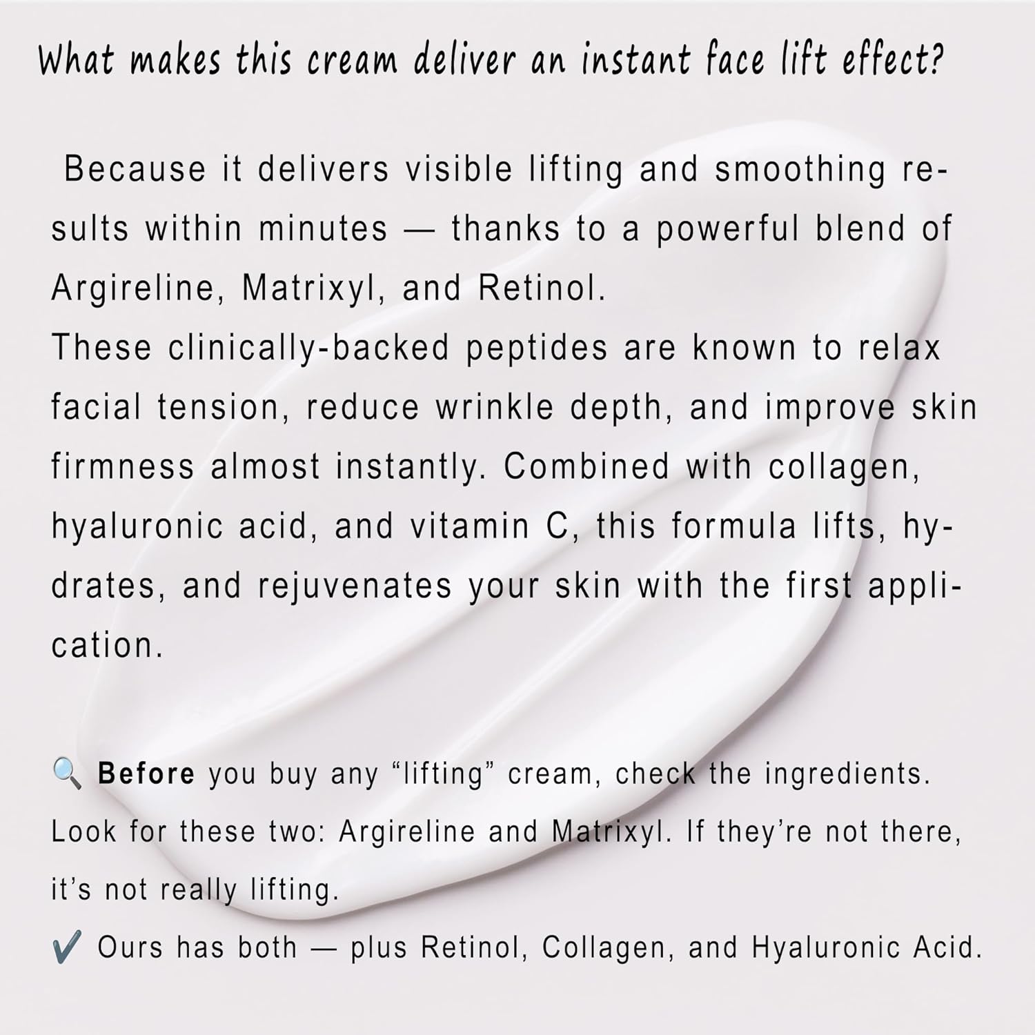 Instant face lift cream with retinol peptides — Experience a visible lifting effect in minutes without needles. This powerful retinol cream combines Acetyl Hexapeptide-8 (Argireline) and Palmitoyl Peptides to smooth fine lines and mimic a firming, face-lift look.