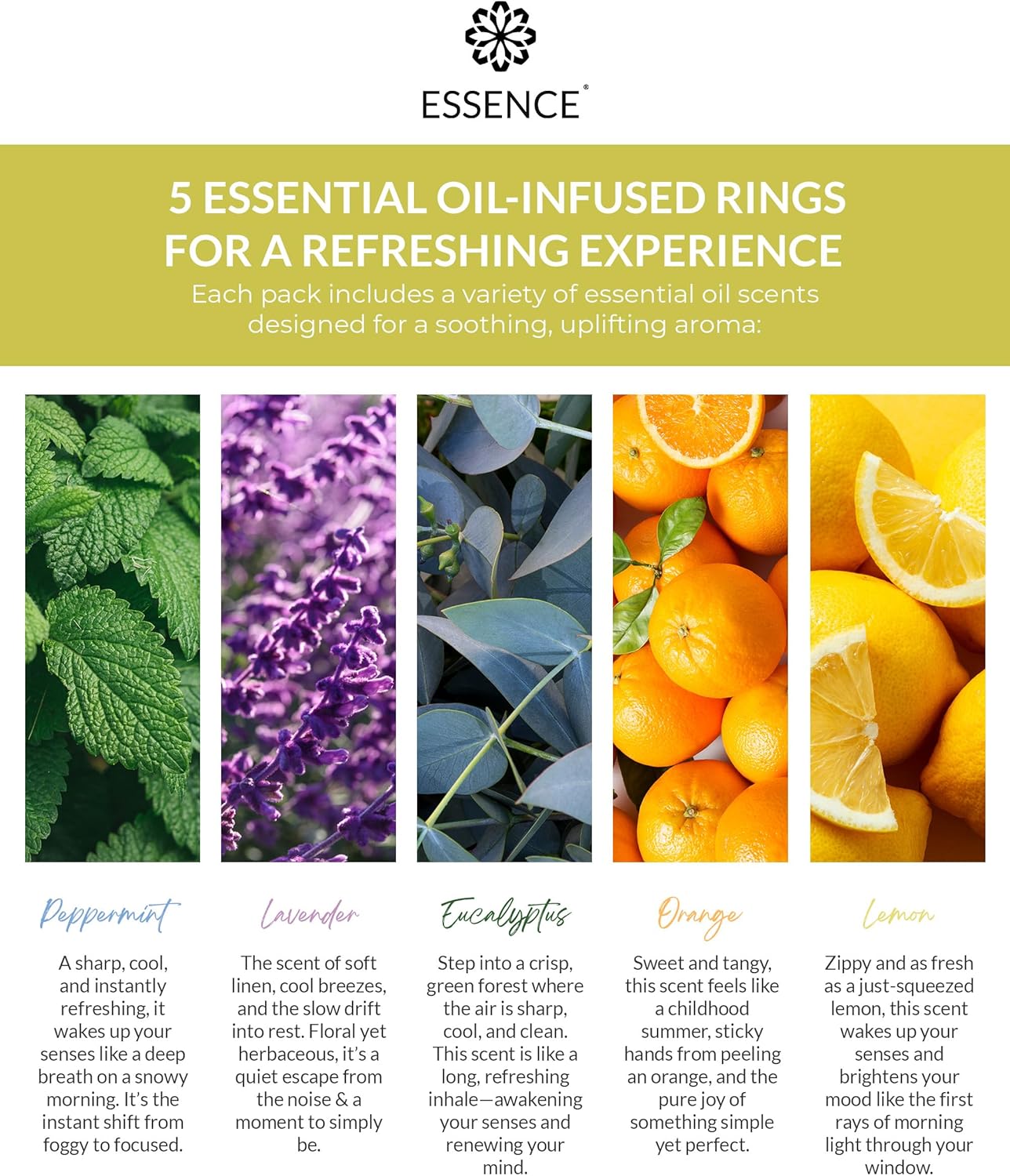 INFUSED WITH 100% PURE ESSENTIAL OILS – Each ESSENCE nose diffuser ring is infused with high-quality essential oils using advanced scent-retention tech, giving you therapeutic fragrance all day.