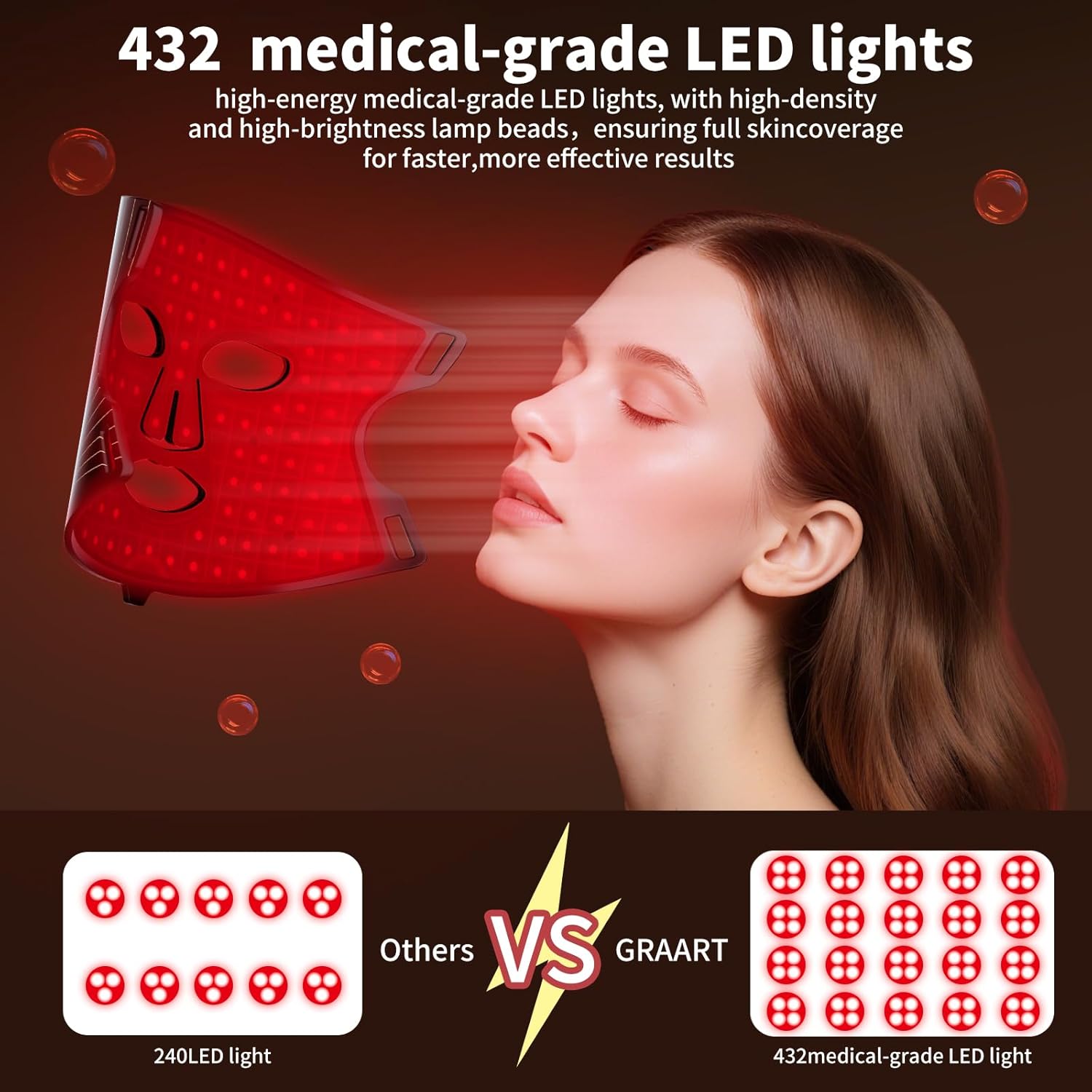 Safety and effectiveness:FDA approved red light therapy(FDA510(K)Number:K243555) clinical safety verification ensure safety and effectiveness. 432 high-energy medical grade red light therapy, with high-density and high-brightness lamp beads, can generate energy up to 52-100mW/cm². This red light therapy mask offers 5 adjustable energy levels to meet different needs, with easy operation
