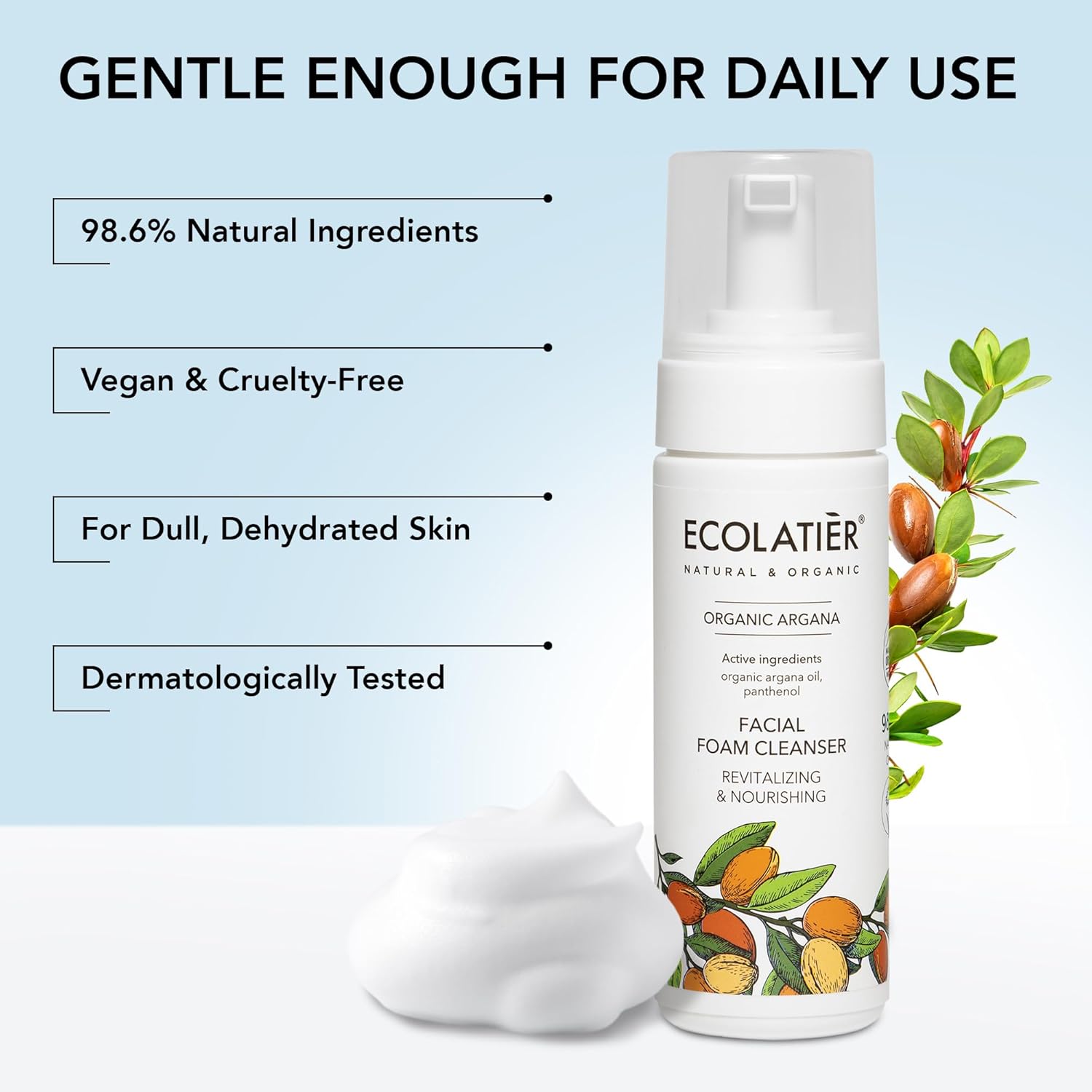 Foaming Facial Cleanser with Organic Argan Oil – 98.6% Natural, Vegan, Revitalizing & Nourishing Organic Argana, Anti-Aging, Removes Impurities, 5.1 Fl Oz – ECOLATIER