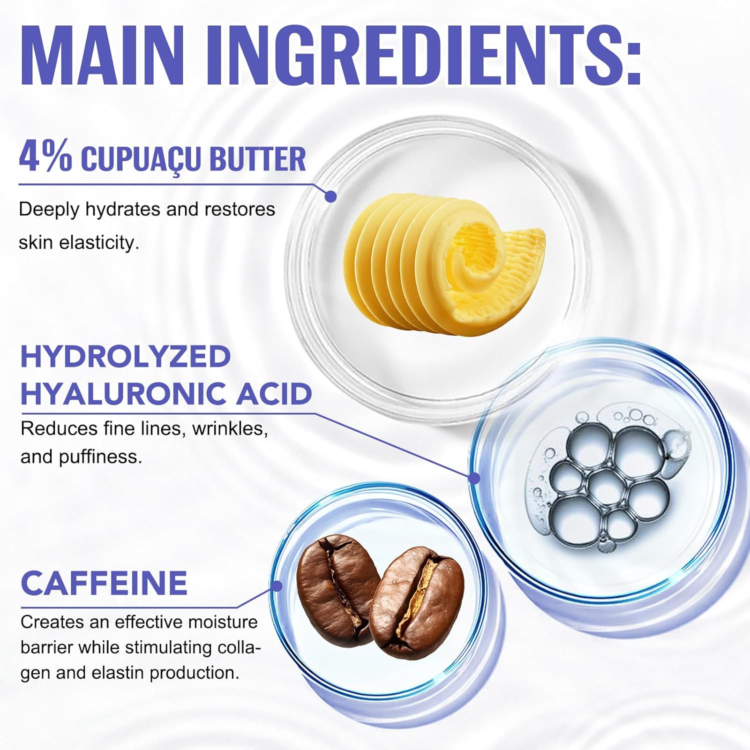【Natural Anti-Wrinkle Formula】Our tighten & lift neck cream Infused with 4% Cupuaçu Butter to deeply hydrate and restore elasticity, along with Hydrolyzed Hyaluronic Acid to diminish fine lines, wrinkles, and puffiness, it’s designed to help your skin radiate its natural beauty.