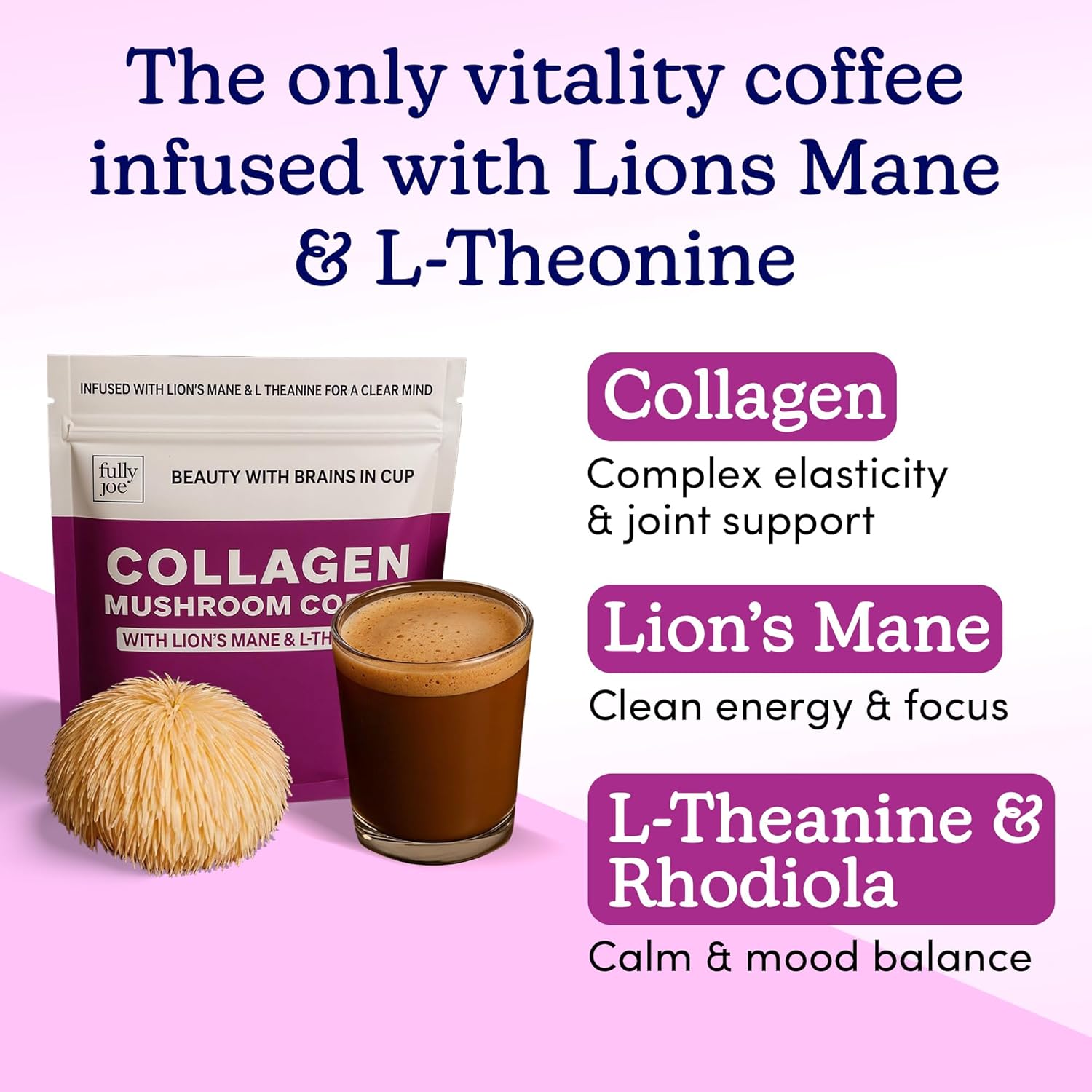 Fully Joe’s Beauty & Brain Collagen Coffee – Grass-Fed Collagen with Lion’s Mane & L-Theanine | Skin, Hair & Focus Support | Creamy Dairy-Free Nootropic Coffee (23 Servings)