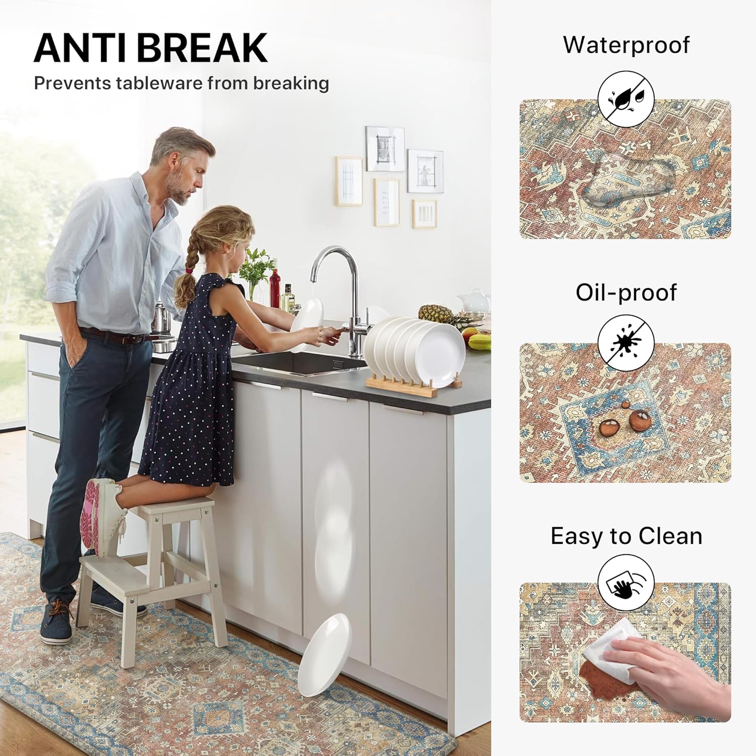 Easy to Clean: Our vintage kitchen rugs are crafted from premium waterproof materials, these kitchen accessories effectively resist water, oil, and dirt penetration. Simply wipe with a damp cloth for quick clean-up. The durable surface maintains appearance even in busy spaces like under sink mats, fridge front rugs, or pet feeding mat areas, making them household essentials for easy maintenance