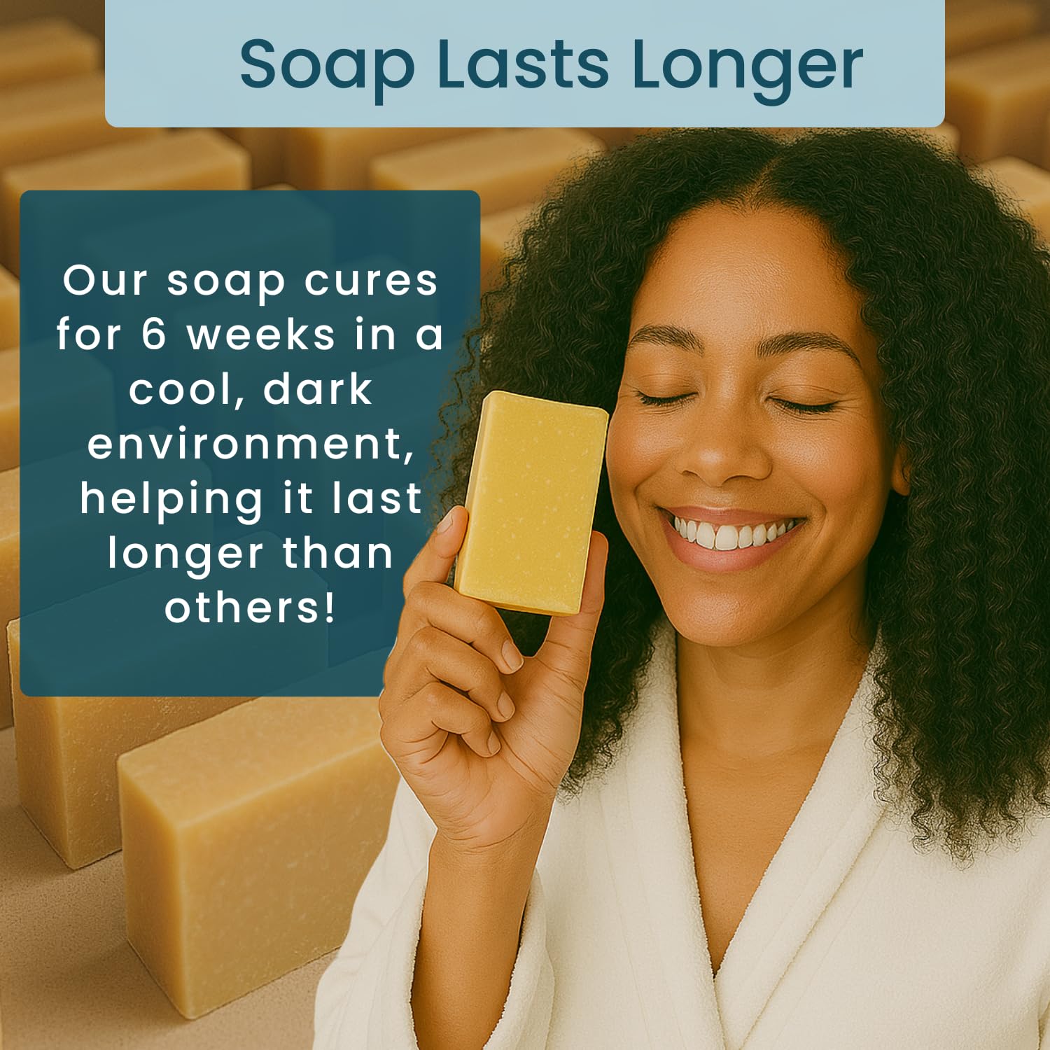 Handmade in America: Our artisan, cold process, natural soap is aged for a minimum of 6 weeks in a cool, dark environment. This allows it to fully cure, making it last longer than other soaps.