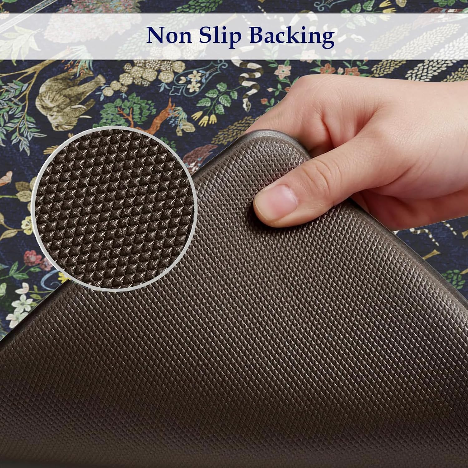 Non-Slip Kitchen Rug:Equipped with a padded non slip bottom so that the standing mat stays in place both on hard and carpet floors.Fully protect you and your family’s safety when using this rubber backing mat.Tip:Should be placed on dry surface during use