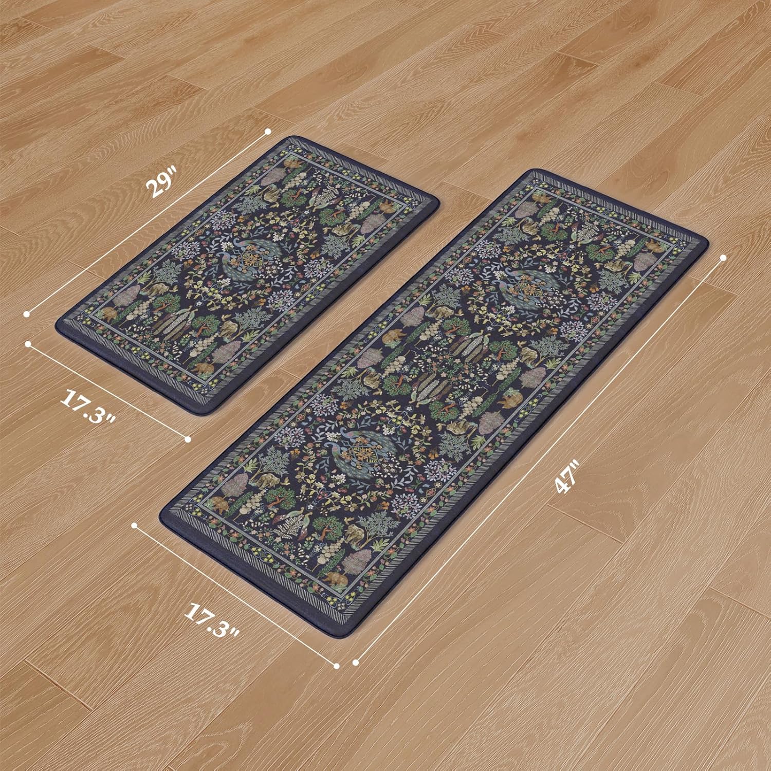 2PC Kitchen Rugs:The kitchen mats contain 2 rectangular rugs (17 x 47 inches and 17 x 29 inches), 2 Pcs kitchen mats may be used separately or in combination to meet different needs.The mats are made of premium materials, which are friendly to your kids and pets