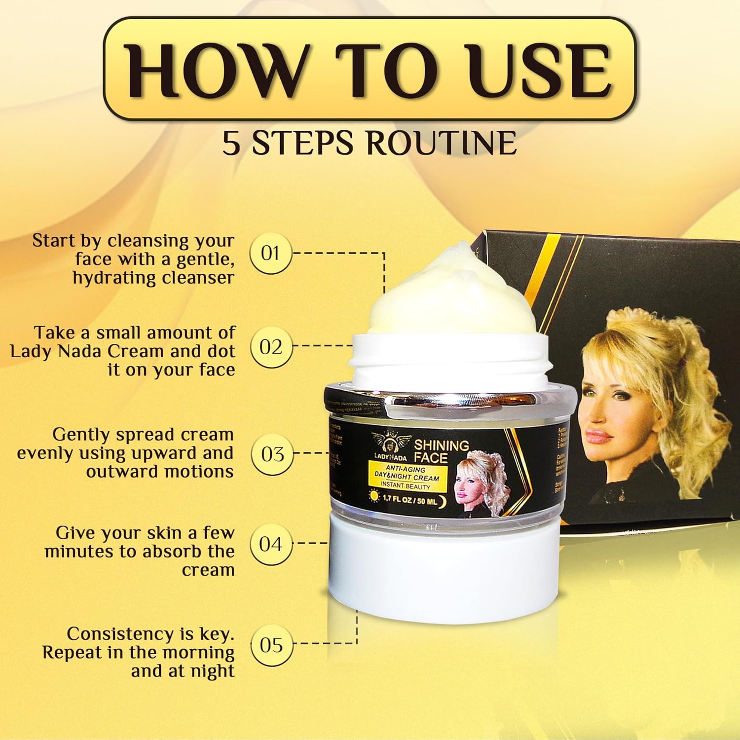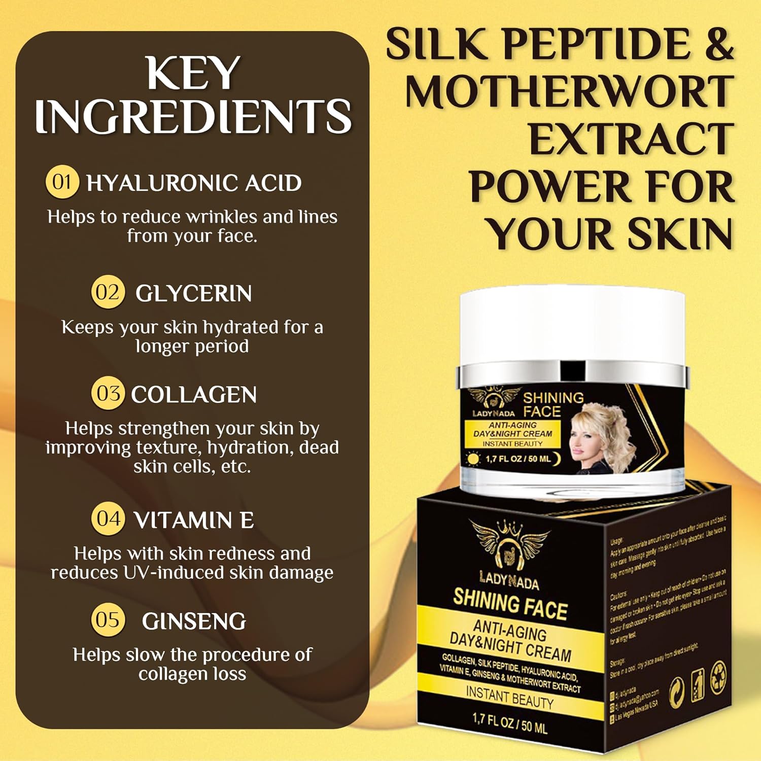 ✅ LONG-LASTING HYDRATION – DAY & NIGHT USE Experience all-day hydration that lasts up to 8 hours after just one application. LADY NADA’s anti-aging formula works both as a day cream under makeup and a night cream for deep skin renewal. With continued use, it helps visibly smooth fine lines and wrinkles while improving skin texture, tone, and elasticity over time.