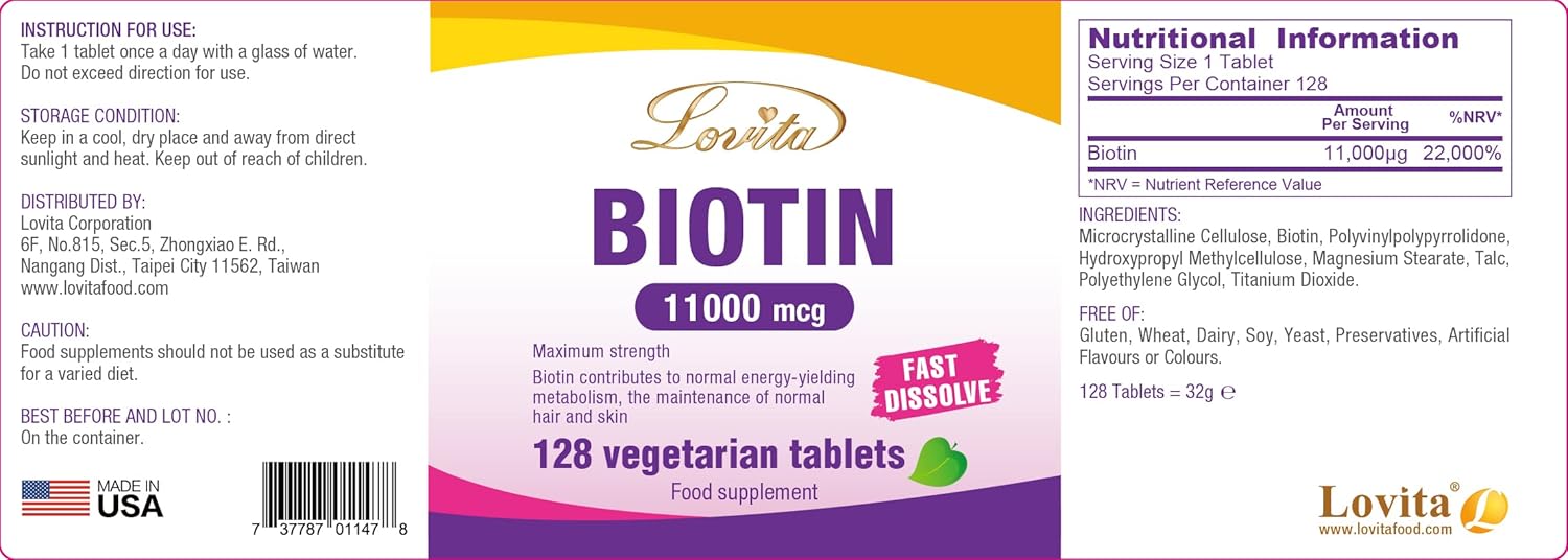 Lovita Maximum Strength 11,000mcg Biotin: Fast-Dissolving, Vegetarian Tablets – Easily Absorbed, Gluten & Dairy-Free, 128 Vegan-Friendly Tablets (Pack of 3)