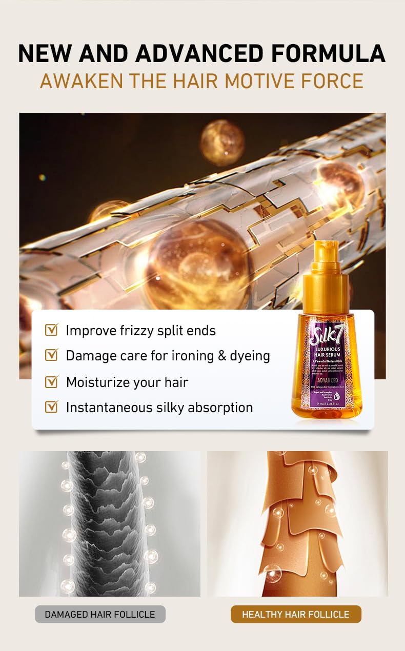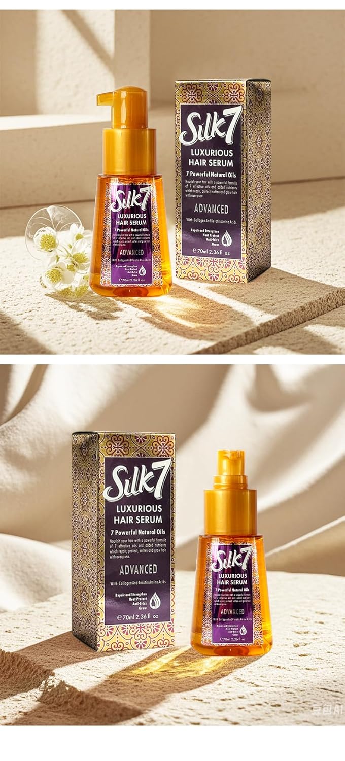 Say Hello to Beautiful Hair with silk 7 luxurious hair Serum. This fast-absorbing hair serum helps to quickly regenerate, protect, nourish , grow and hydrate, dull and dry and brittle hair. Leaves your hair feeling fuller, restores lustre and heals damaged hair. With Silk 7, a little goes a long way, so 1 to 3 pumps is all you need per single use. Enjoy our new advnaced formula of 7 powerful oils with added collagen and Keratin amino acids. Key Ingredients : Advanced with added Collagen + Keratin Amino Acids – Improve elasticity and smoothen strands for healthier, stronger, shinier Hair Argan Oil – Rich in fatty acids and vitamin E. Natural conditioner that provides deep hydration (amongst other benefits) Batana Oil – Contains a lot of antioxidants and vitamin E. This “can help rebuild the hair’s structure and reduce oxidative stress. ( amongst other benefits) Rosemary Oil – a stimulating ingredient that promotes hair growth while stimulating blood flow when applied to scalp, ultimately strengthening the hair follicle. Clove Oil – It helps hair combat dry split ends. It also actively strengthens existing hair and adds volume over time when used consistently. A great Hair growth stimulator too. Jojoba Oil – Nourishes to prevent hair breakage and strengthen strands. Moringa Oil – Improves shine and elasticity: can revitalize dull, brittle strands. It is also a natural conditioner for shiny and bouncy hair. Chinese mint Oil – Improves scalp health and promotes growth How to Use : Apply one to two pumps on clean towel dried hair .Massage on to lengths and ends .Blowdry and style as desired, adding a small pump of the serum where it is needed. Apply to dry or styled hair as a finishing touch or to tame flyaways and seal split ends. Can be applied directly to dry or itchy scalp for relief and prevention of dandruff. Use as a Pre-wash Treatment : For extremely dry and damaged hair apply a generous amount of Silk 7 luxurious hair serum to damp hair , wear a shower cap or wrap in a warm towel for 10 minutes. Wash with a sulphate free shampoo, dry on low heat and style as desired. Add a pump or two to nourish the lengths and ends and tame flyaways Can be used on Wigs and Hair Extensions to style, tame and treat.