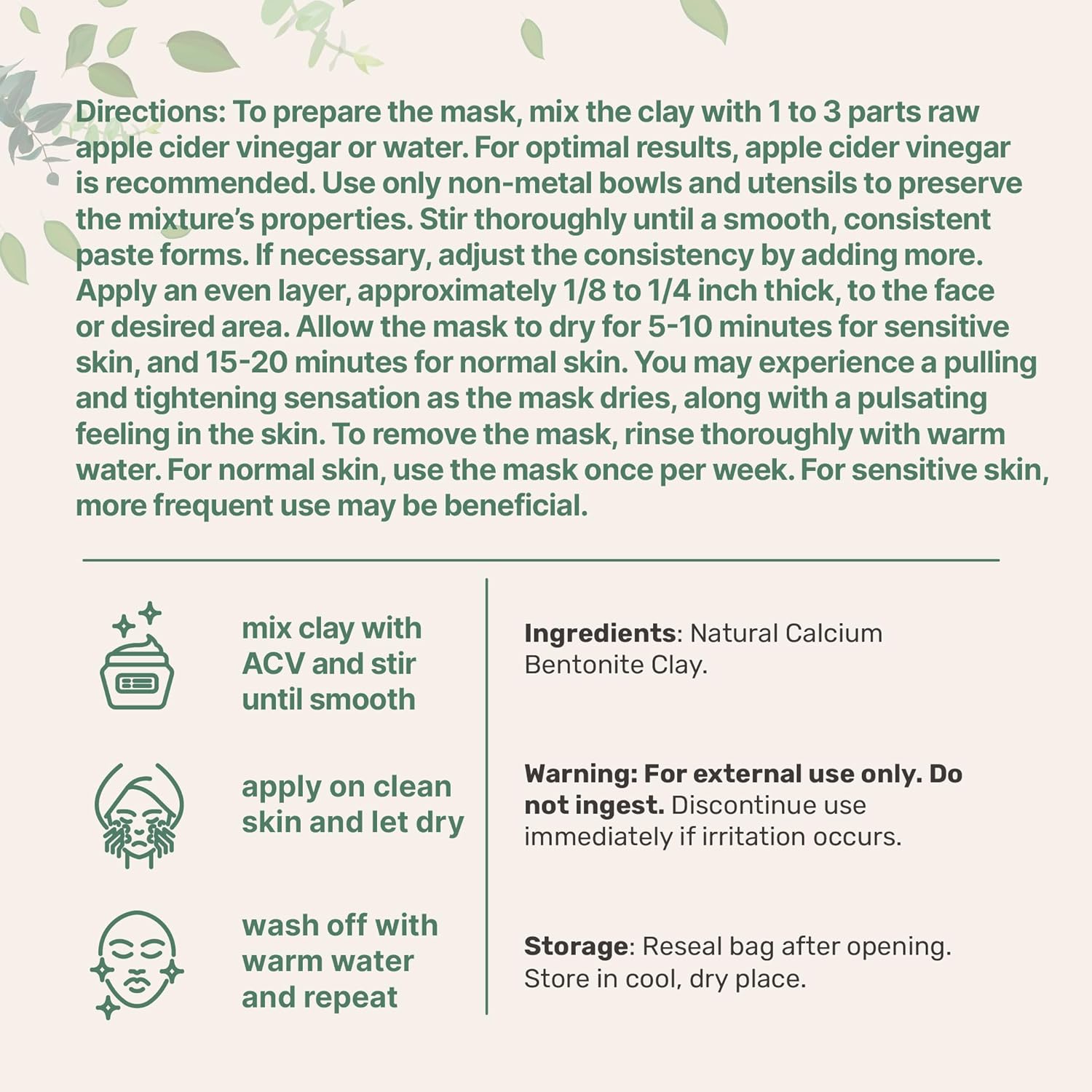 Each pouch provides 2 pounds of Natural Calcium Bentonite Clay, which calcium bentonite is known to offer gentle absorption on the skin and should be used for external use only.