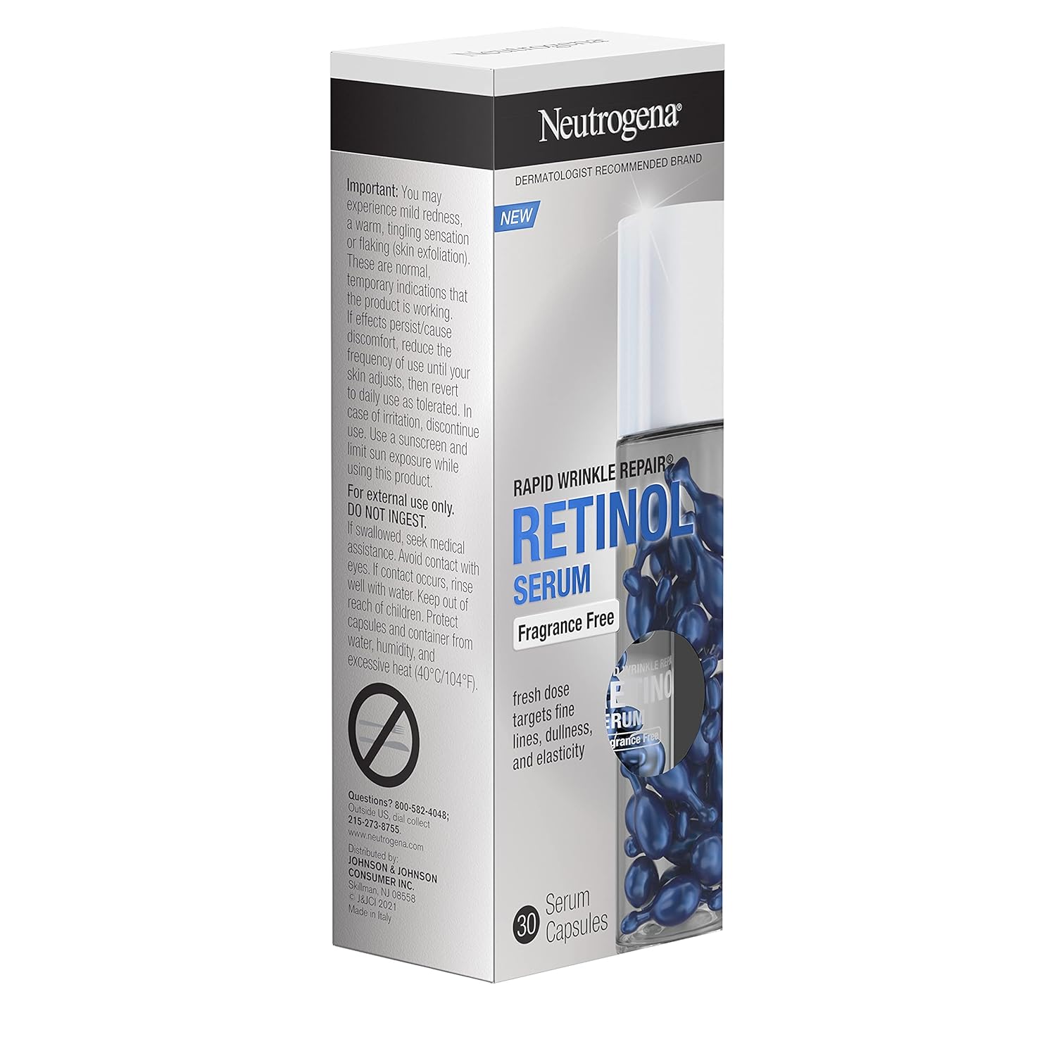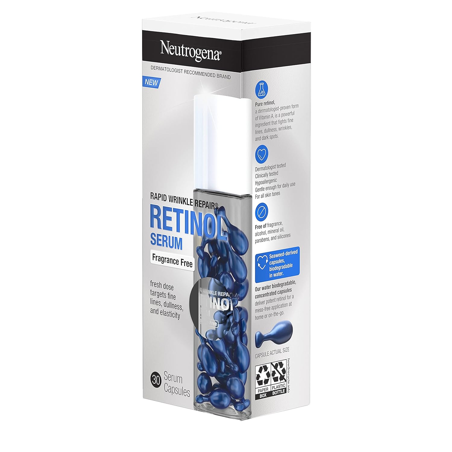 30-capsules of Neutrogena Rapid Wrinkle Repair Fragrance-Free Retinol Face Serum to target fine lines, dullness, wrinkles and skin elasticity while leaving skin feeling hydrated, nourished and plumper