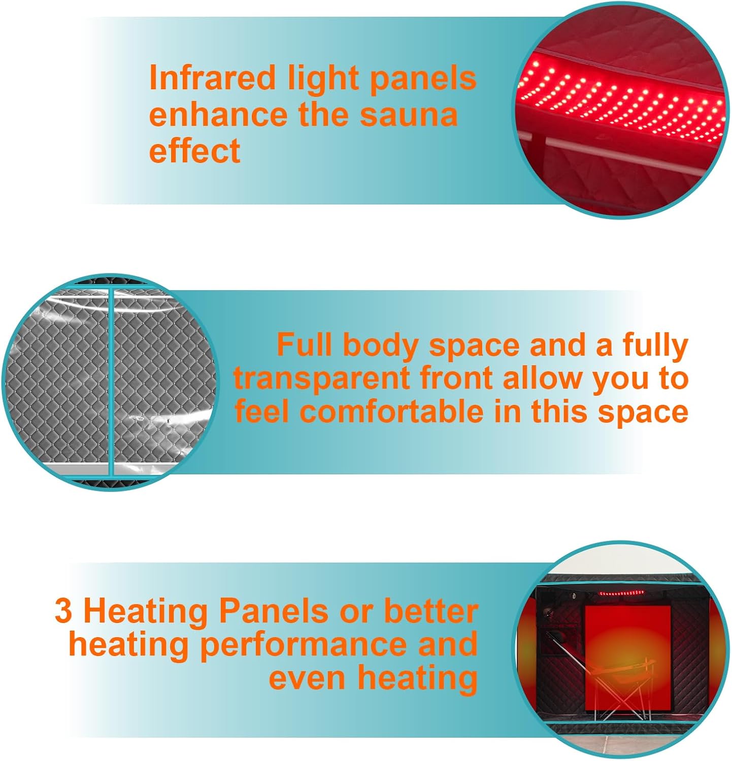 3 PCS Carbon fiber heaters:Sauna tent has been upgraded with 3 large Carbon fiber heaters for all-round heating and better heating efficiency