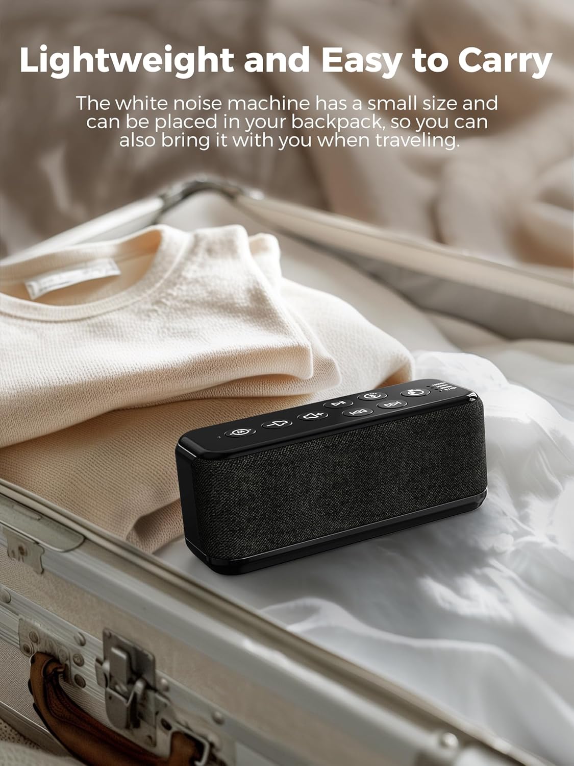 [Built-in Battery & Portable Design] This portable sound machine features a built-in 3000mAh battery, offering 8-42 hours of continuous playtime on a full charge. Perfect for travel or power outages, it ensures uninterrupted soothing sounds wherever you go. With Type-C charging and a compact design, this noise machine is easy to pack and use, providing a consistent sleep environment at home, in the office, or on the road.