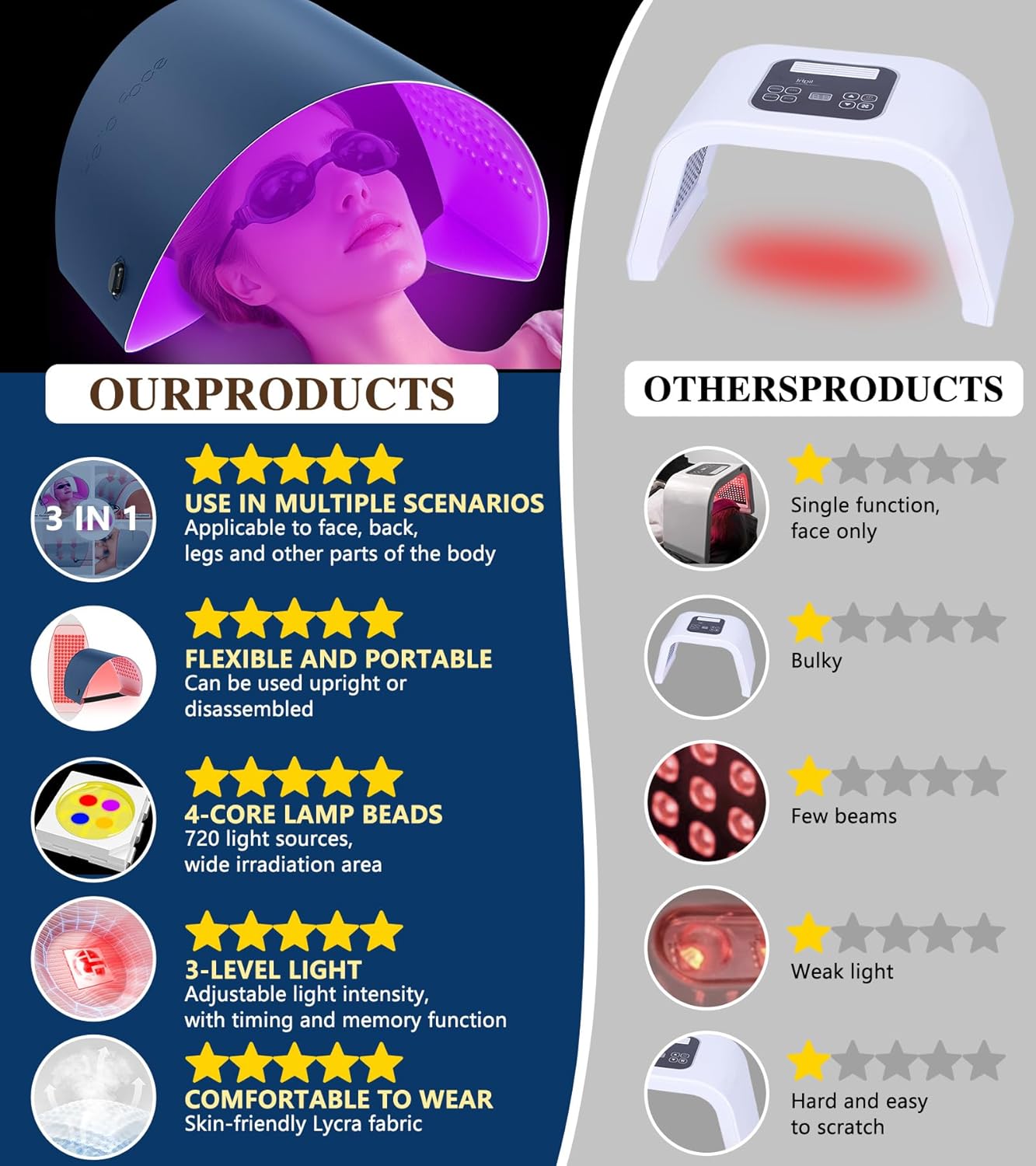 Powerful Light Technology: Engineered with 720 powerful LED chips and 4-chip technology, this led light therapy for face offers consistent, deep-penetrating light to boost skin renewal and radiance while being gentle on all skin types