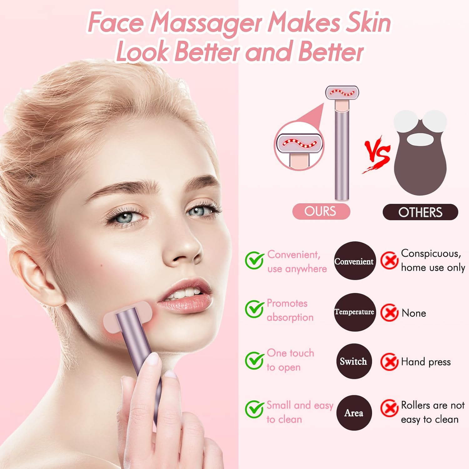 4-in-1 Red Light Therapy: Our Facial wand combines red light therapy, facial massage, and therapeutic warmth, which speeds up at least twice the absorption of skin care products.