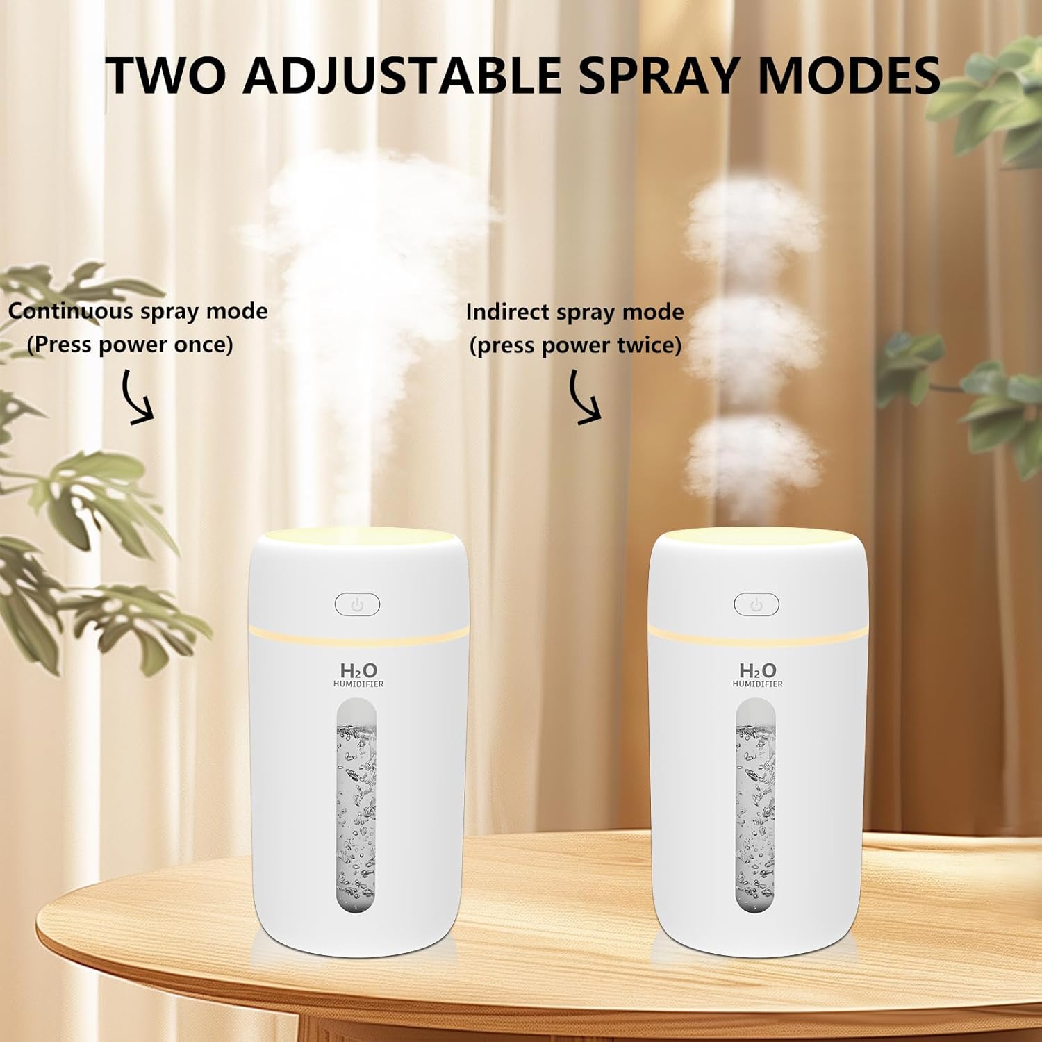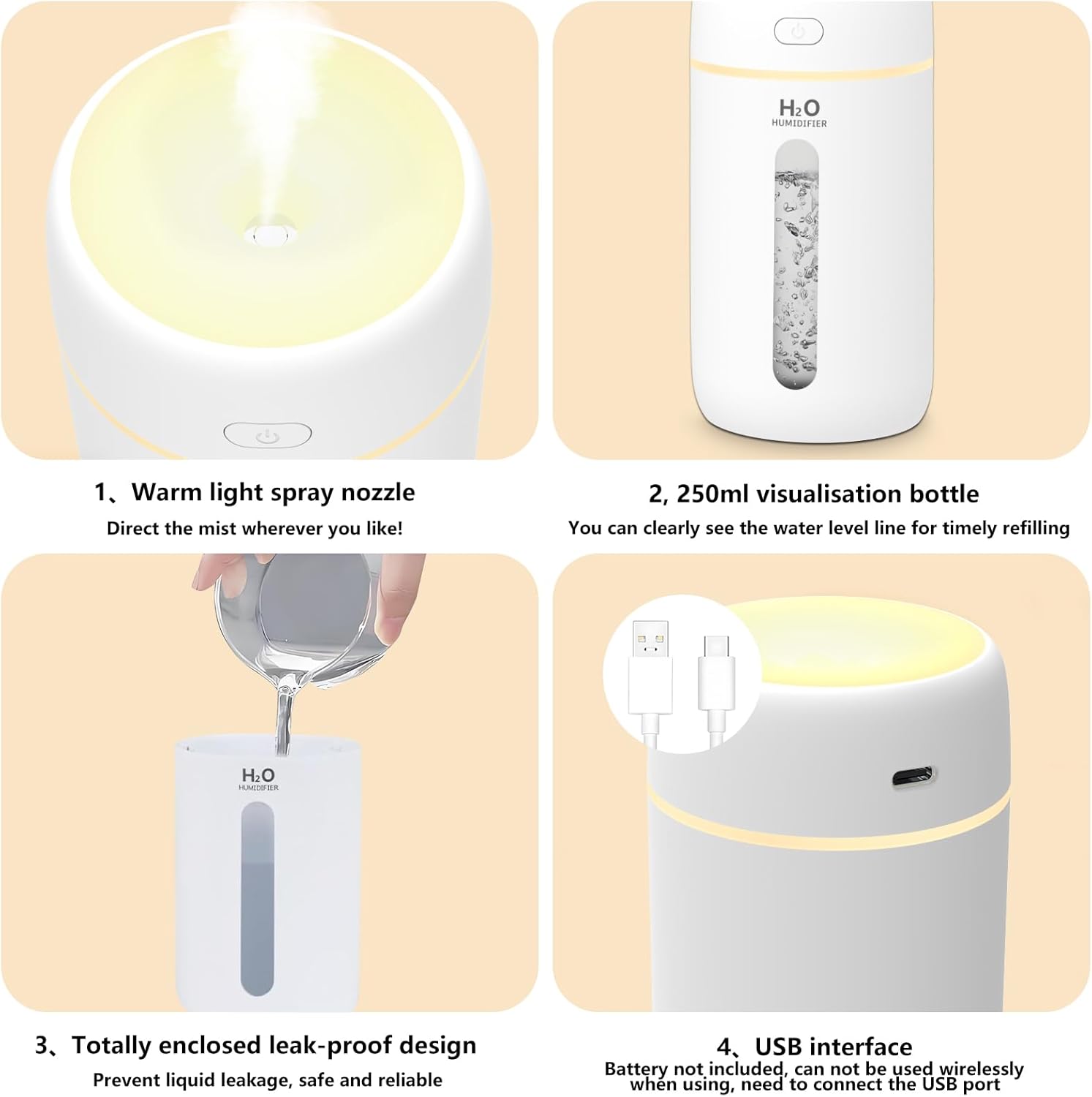 【Dual Mist Modes+Soft warm LED light】- This mini humidifier has two modes: continuous spray & intermittent spray, the spray can last up to 6 hours in continuous mode and last up 4 hours in intermittent mode. 250 ml Small humidifier for your daily needs. Soft warm LED light enhances relaxation during long drives or in your home office.