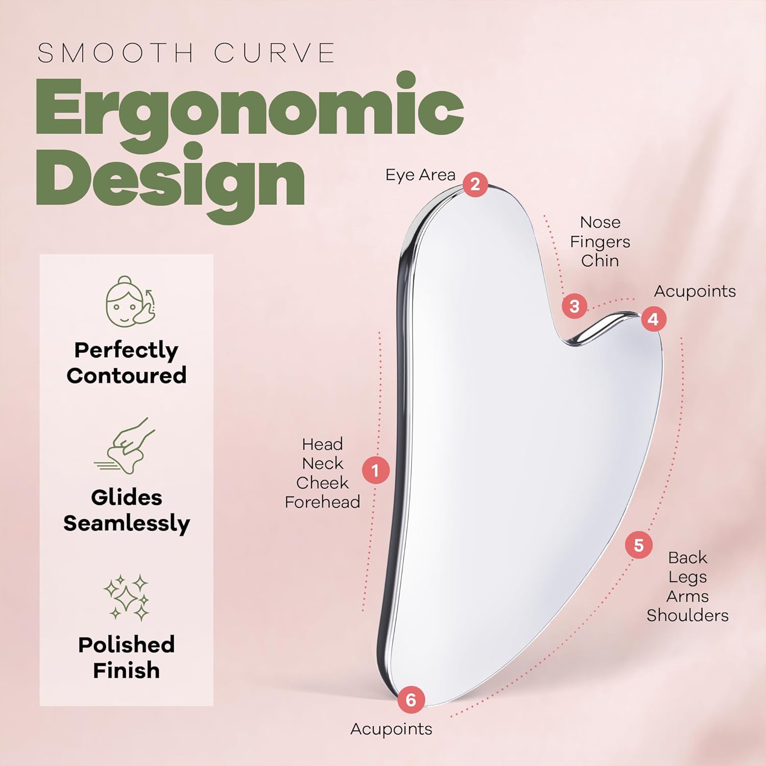 CONTOUR TO YOUR FACE – Ergonomically designed with a curved shape to fit your face and neck perfectly. Easily glide this face Gua Sha stainless steel massage scraper tool along skin for a soothing massage, reducing puffiness and leaving a healthy glow that enhances natural beauty.
