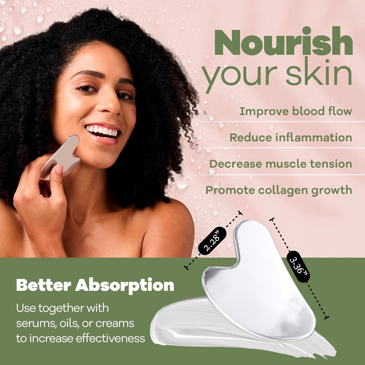 SKINCARE ABSORBS BETTER – Safely use this guasha stainless steel scraper tool for massage and as a lymphatic drainage tool. This tool assists in the application of facial creams and serums, allowing greater absorption into the skin, and letting you get the most from your expensive products.