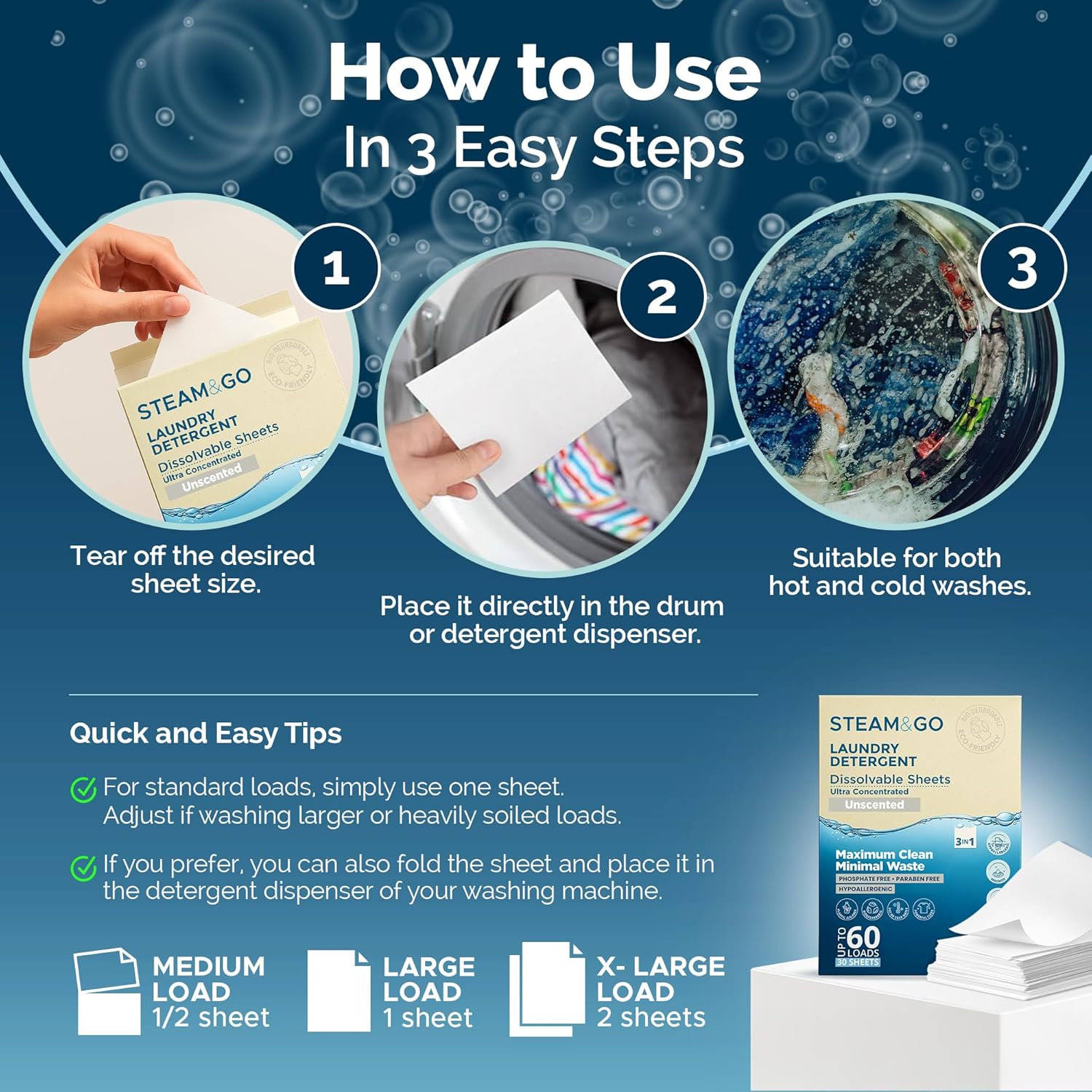 Steam and Go Laundry Detergent Sheets – 3in1 Dissolvable Sheets with Deep Cleaning, Fragrance-Free, & Hygienic Purifying Action – Hypoallergenic, Vegan & Cruelty-Free – Unscented – 30 Ct
