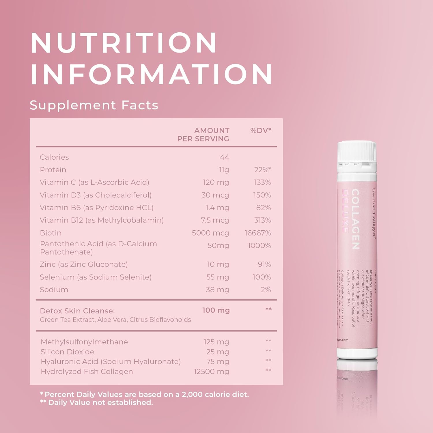 Swedish Collagen Deluxe | 12,500 mg Hydrolyzed Marine Collagen Liquid Supplement – 20 x 25 ml Daily Shots | Hyaluronic Acid, Biotin and Vitamin C for Healthy Hair, Skin, Nails and Joints | Sugar-Free