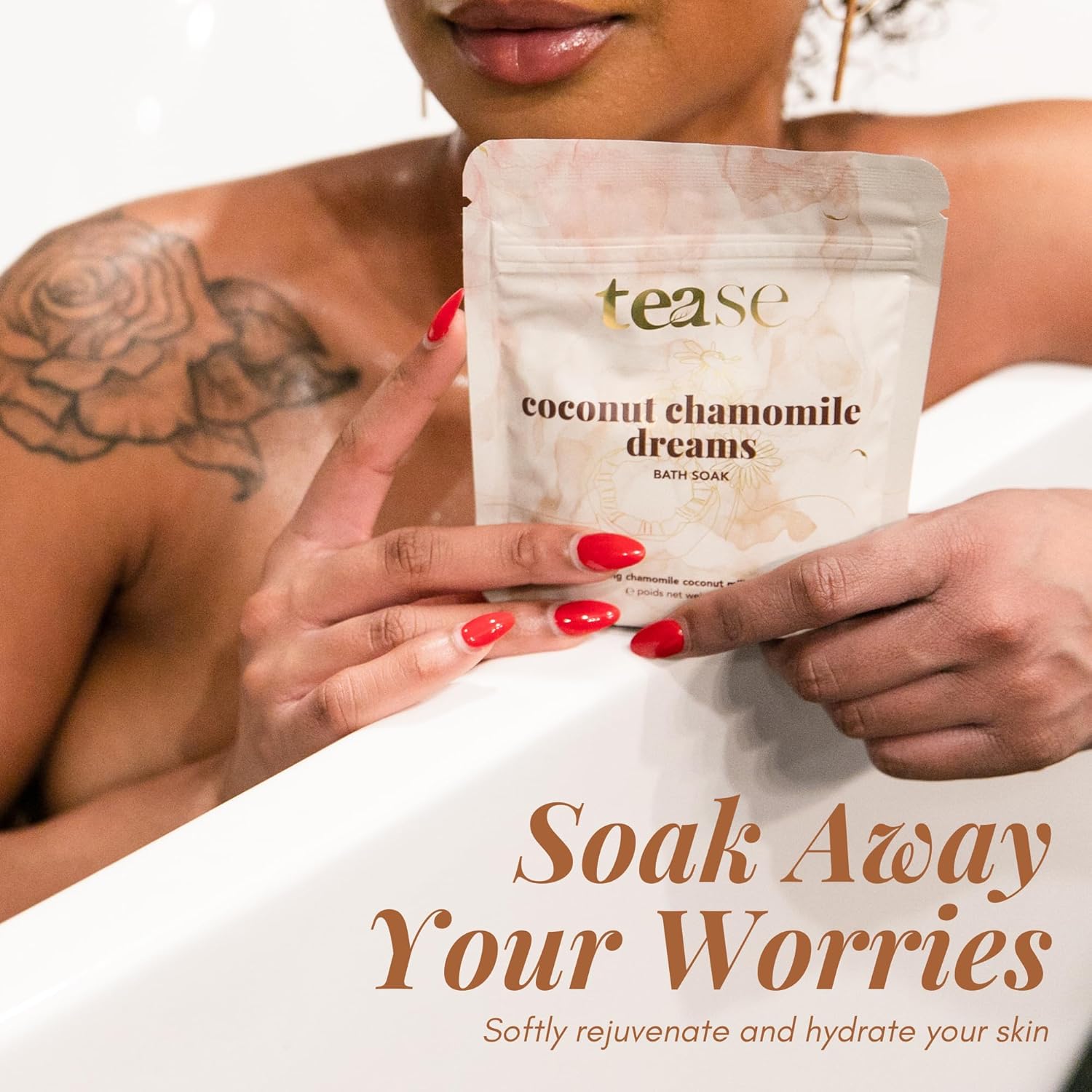 Skin That Glows: Slip into a luxe hydrating bath treatment with Tease Tea detox bath salt. Remove dull skin with ethically sourced organic Egyptian chamomile flowers and creamy coconut milk.