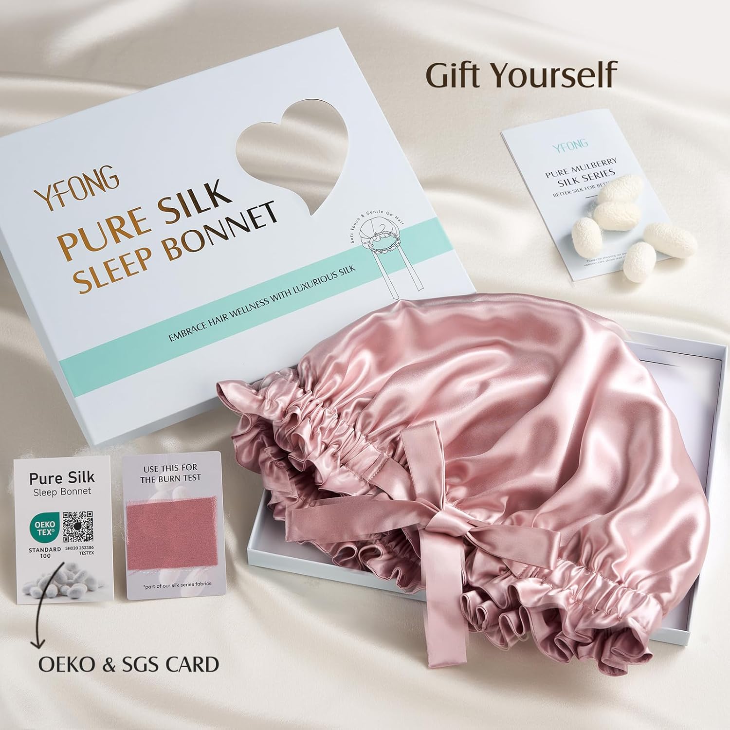 Luxurious 100% Pure Mulberry Silk Bonnet, No Other Fabric Added: YFONG double layers silk bonnet (Outer & Inner Layers & Straps) are all made of the highest grade 6A 22 momme mulberry silk. Natural silk fabric and double-layered design create a smooth, soft, lightweight, comfortable and lustrous bonnet, offering unmatched comfort and double hair protection. The fabric of our pure silk bonnet has passed the SGS authentication & OEKO certified, ensures real silk and harmless.