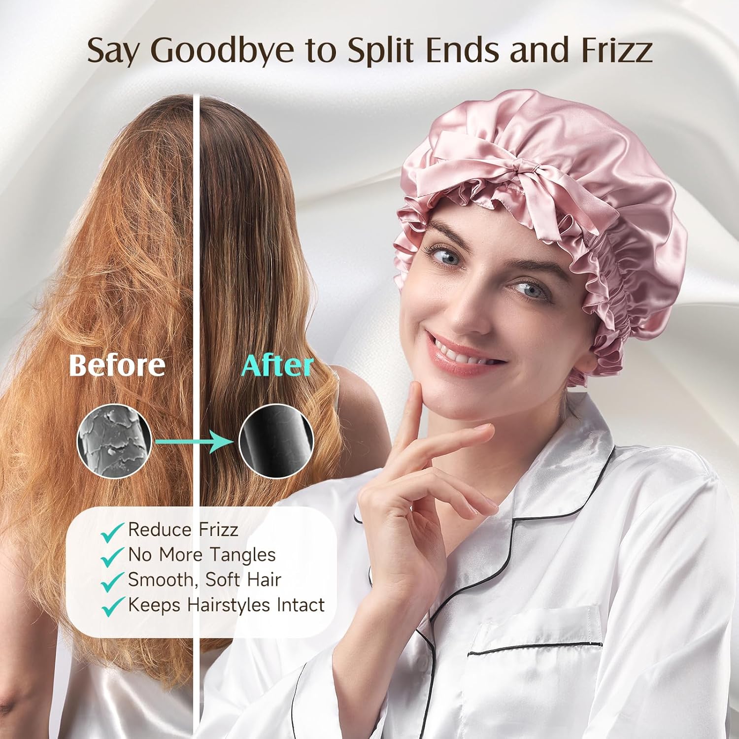 SPA-LIKE Hair Care You Can Feel: 100% mulberry silk bonnet for sleeping women have a soft, smooth texture that allows hair to slide across its surface, help lock hair moisture, prevent dryness, frizz, split ends. Keeps your hairstyle fresh looking, and prevents loss of hair and wake up with no frizz and keeps hairstyle intact. Wearing your hair overnight in a mulberry silk hair bonnet for sleeping is a naturally nourishing conditioning treatment.